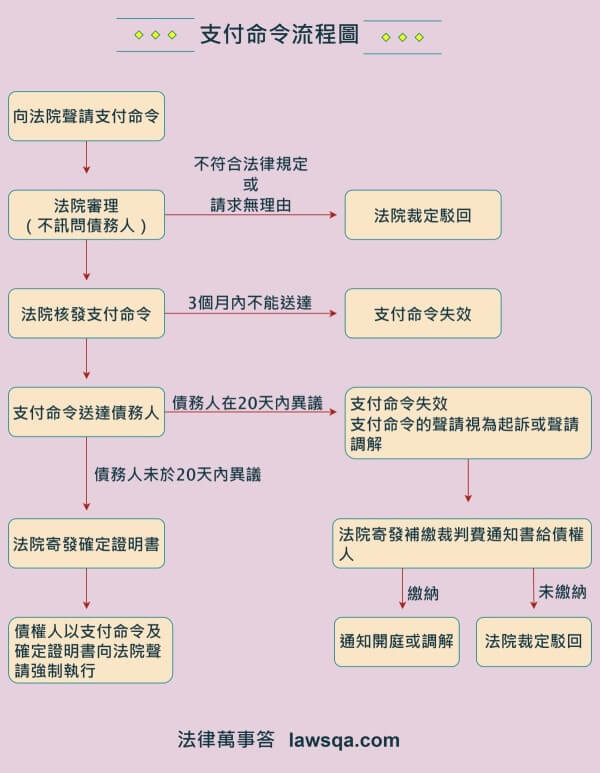 債權人對於債務人請求給付一定數額的金錢(例如:100萬元)、代替物(例如:米一斤)或有價證券(例如:台積電股票一張)時,得請求法院核發的一種文書。例如:甲向乙買一支2萬元的手機,乙已經把手機交給甲,可是甲遲遲沒有付錢,乙就可以檢附甲、乙間的買賣契約為證據,向法院聲請核發支付命令,如果甲收到支付命令後20日內聲明異議,支付命令就自動失效,乙原來支付命令的聲請就視為起訴或聲請調解。如果甲沒有在上述期間內聲明異議,乙就可以根據支付命令對甲的財產聲請強制執行。但如果支付命令無法於核發後三個月內送達債務人,就失其效力。